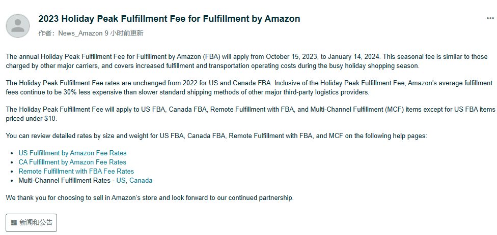 亞馬遜在公告中寫到,亞馬遜的年度假日高峰配送費(fèi)用(FBA)將在2023年10月15日至2024年1月14日期間生效。