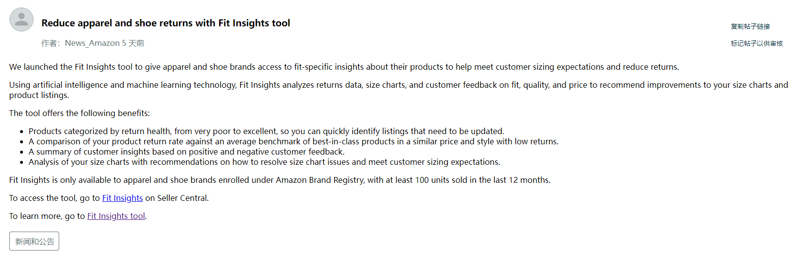 需要注意的是,FitInsights只適用于在亞馬遜品牌注冊的服裝和鞋類品牌,且過去12個月內最少售出100件。