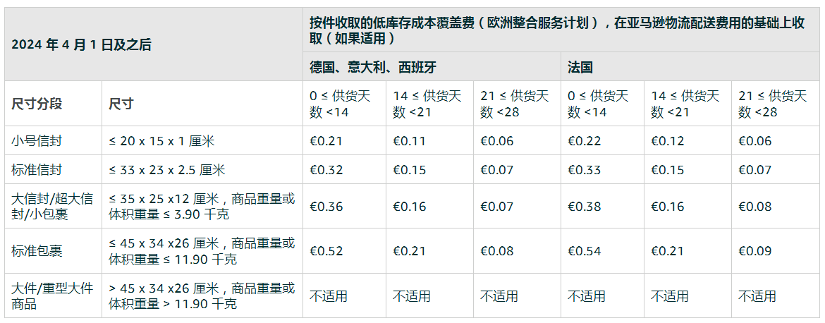 自2024年4月1日起,針對通過亞馬遜物流歐洲整合服務(Pan-EU)計劃配送的標準尺寸商品,假如德國、法國、意大利和西班牙商城的庫存商品數量相較于已發貨商品數量低過28天,亞馬遜將收取低庫存成本覆蓋費。