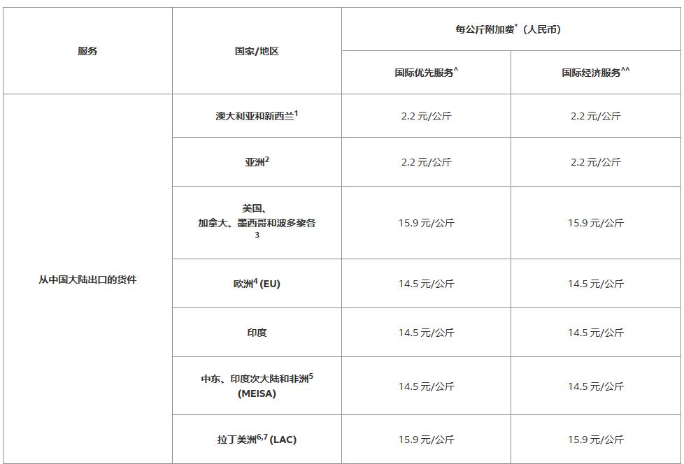 Fedex則計劃于9月16日起征繳需求附加費。Fedex方聲稱當運量增長、運力需求的增加、運營成本增加還有其運營網(wǎng)絡面臨別的壓力時,F(xiàn)edEx也許會收取需求附加費,詳細如下↓