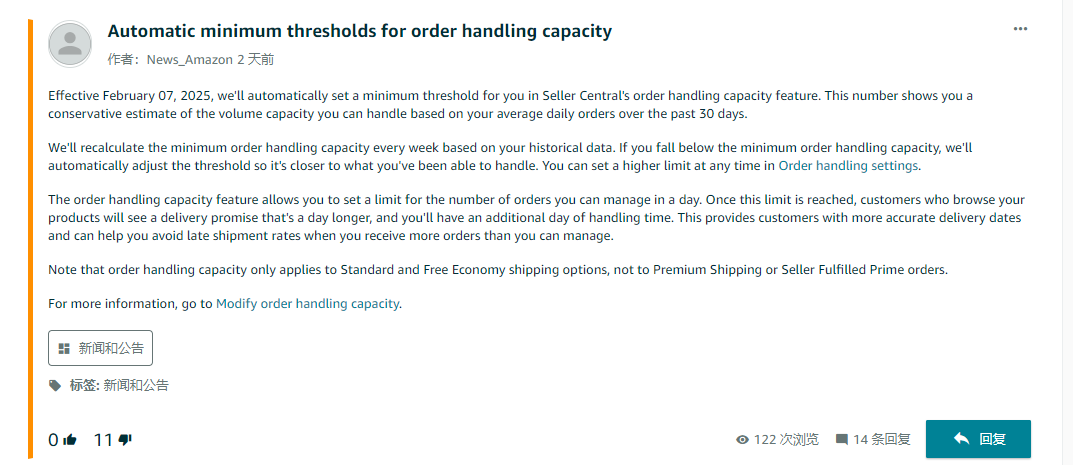 亞馬遜在公告中表示,自2月7日起,將會在Seller Central的訂單處理能力功能中自動為賣家設一個最低閾值。該閾值是基于賣家過去30天的平均每日訂單量做出的保守估計,用于顯示賣家可以處理訂單的容量。